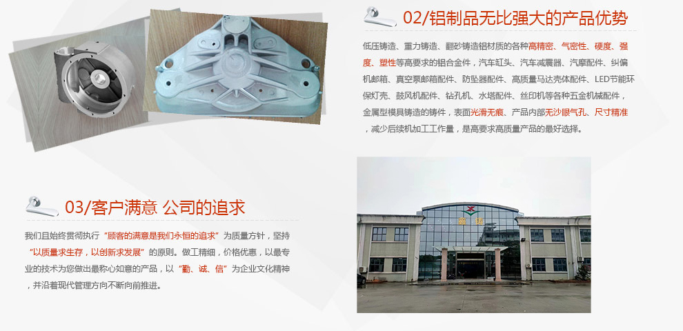 東莞市鑫鑄鋁制品有限公司坐落于東莞市沙田鎮大泥村委金和村金和路,交通方便,技術力量雄厚,有十五年的鑄造實踐經驗,對鑄造鋁合金、低壓制造、重力制造、技術、要求比同行業要領先一步。 本公司專業低壓鑄造、重力鑄造、翻砂鑄造鋁材質的各種高精密、氣密性、硬度、強度、塑性等高要求的鋁合金件,新能源汽車電機殼、端蓋、機器人關節臂、汽車缸頭、汽車減震器、汽摩配件、糾偏機郵箱、真空泵郵箱配件、防墜器配件、高質量馬達殼體配件、LED節能環保燈殼、鼓風機配件、鉆孔機、水塔配件、絲印機等各種五金機械配件,金屬型模具鑄造的鑄件,表面光滑無痕、產品內部無沙眼氣孔、尺寸精準,減少后續機加工工作量,是高要求高質量產品的最好選擇。我們且始終貫徹執行“顧客的滿意是我們永恒的追求”為質量方針,堅持“以質量求生存,以創新求發展”的原則。做工精細,價格優惠,以最專業的技術為您做出最稱心如意的產品,以“勤、誠、信”為企業文化精神,并沿著現代管理方向不斷向前推進。